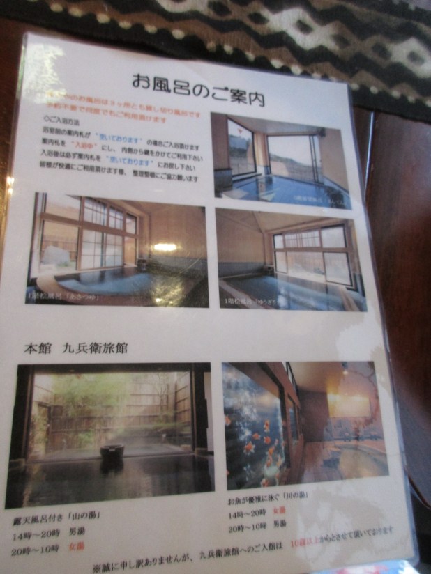 I’m going in by myself. Such a luxury! Notice my “yukata” (not a kimono.) It’s what people wear in onsen hotels.