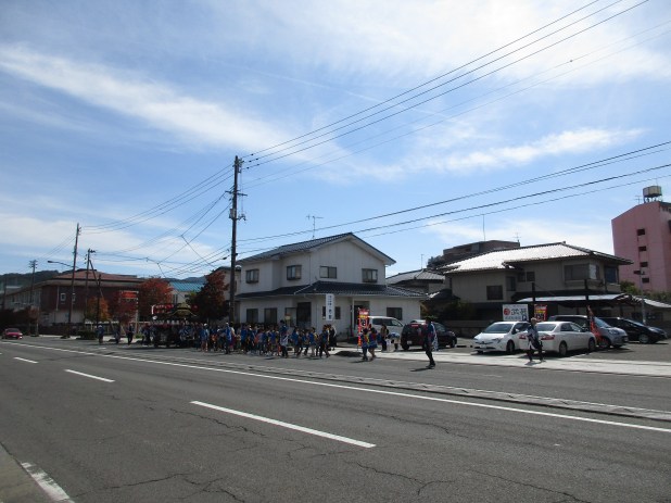 This was Saturday around 4:00 in the afternoon. (October 7, 2017) I was walking to the place where we meet. This is my neighborhood, Bansei. Each neighborhood in the old part of Fukushima City participates in the festival.  Lots of people come from the newer parts of the city to watch us.
