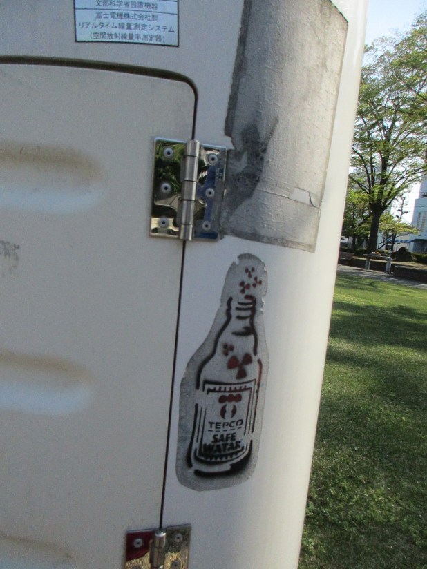 And then I pointed out to him this interesting sticker some joker stuck onto the droid. Now that I think about, I personally have never seen paint vandalism on the droids. That’s really amazing, now that I think about it. Here in Fukushima City, the droids are always this eggshell white color (and possibly get painted over if there is indeed vandalism. I don’t know. Japan actually does not have very much vandalism.)