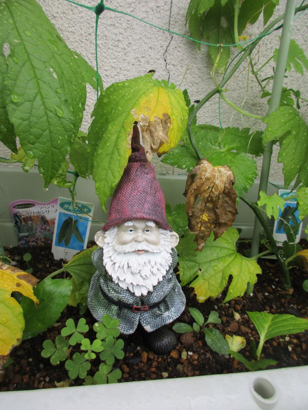 I’m guessing the gnome in the photo is enjoying the rainy weather. But our little stone gnome does look kind of stoned, don’t you think? Blissfully happy…