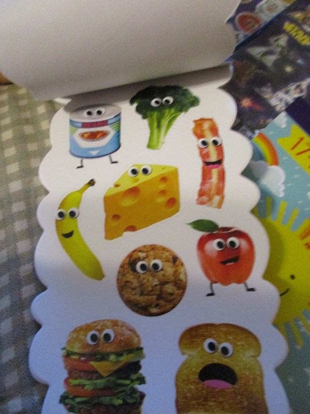 These sorts of stickers with pictures of everyday objects are incredibly useful for my class. For example, I can give the students paper and tell them to create a meal on it, using the stickers. Then they have to come to me and say, “I’d like the cookie, please.” “I’d like the apple, please.”