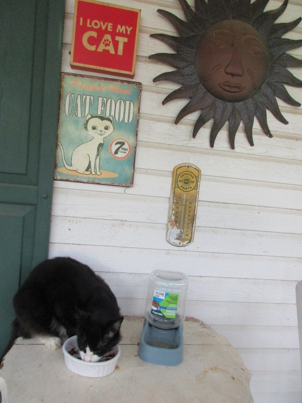 Food is up high to keep away vermin. These cats enjoy being outdoors. (They have a choice of in or out and both of them rarely come in.)