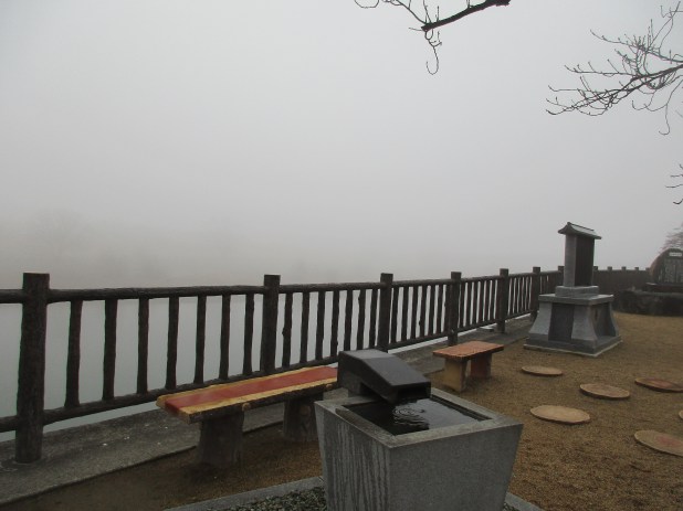 The river is right below…but in this photo, it can barely be seen due to the thick fog.