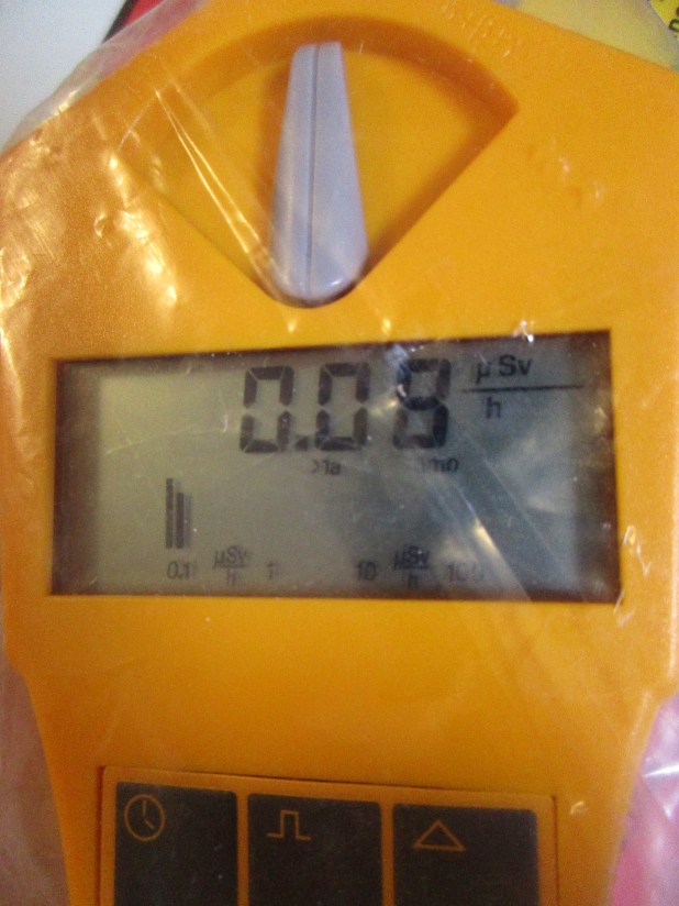 After the meltdowns, my husband purchased a dosimeter off the internet. Cuz, you know, we didn’t already own a device that measured radiation. So anyway, he ordered one. This is what is said this past week when I laid it on our kitchen table and snapped a photo. (Photo from February 2019, downtown Fukushima City)
