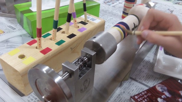In order to paint the stripes around the body, the wooden doll is spun around on this machine.